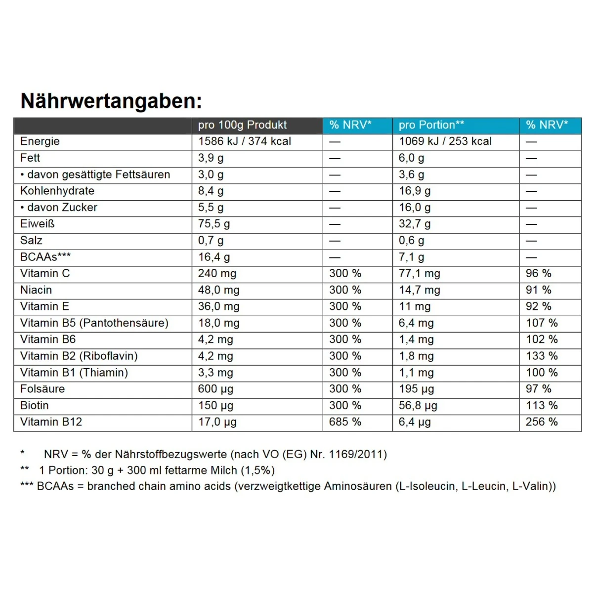 - Zutaten: Molkeneiweiß-Konzentrat (50%), Milcheiweiß (35,2%), Molkeneiweiß-Isolat (4%), Aroma, Schokoladen-Raspeln (Zucker, Kakaomasse, fettarmes Kakaopulver, Kakaobutter, Emulgator Soja-Lecithin) (2%), Dextrose, Hühnereieiweißpulver (1%), Kakaopulver (1%), Emulgator (Soja-Lecithin), Instantkaramell (Karamellzucker, Maltodextrin), Verdickungsmittel (Xanthan), Süßungsmittel (Natriumcyclamat, Acesulfam K, Saccharin), L-Ascorbinsäure, Speisesalz, Nicotinamid, DL-alpha Tocopherylacetat, Calcium-D-Pantothenat, Riboflavin, Pyridoxinhydrochlorid, Thiaminmononitrat, Pteroylmonoglutaminsäure, D-Biotin, Cyanocobalamin