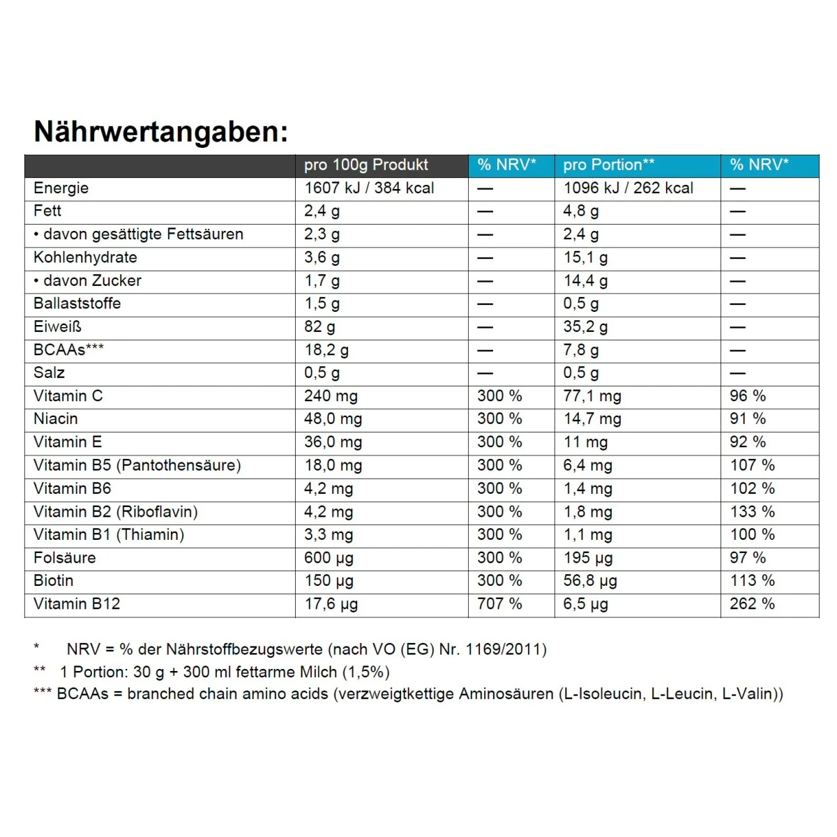 - Zutaten: Molkeneiweiß-Konzentrat (50,0%), Milcheiweiß (37,2%), stark entöltes Kakaopulver (5,0%), Molkeneiweiß-Isolat (4,0%), Emulgator (Soja-Lecithin), Aroma, Hühnereieiweißpulver (1,0%), Karamelzucker (Karamelzuckersirup, Maltodextrin), L-Ascorbinsäure, Süßungsmittel (Acesulfam K, Sucralose), Nicotinamid, DL-alpha Tocopherylacetat, Calcium-Dpantothenat, Riboflavin, Pyridoxinhydrochlorid, Thiaminmononitrat, Pteroylmonoglutaminsäure, D-Biotin, Cyanocobalamin