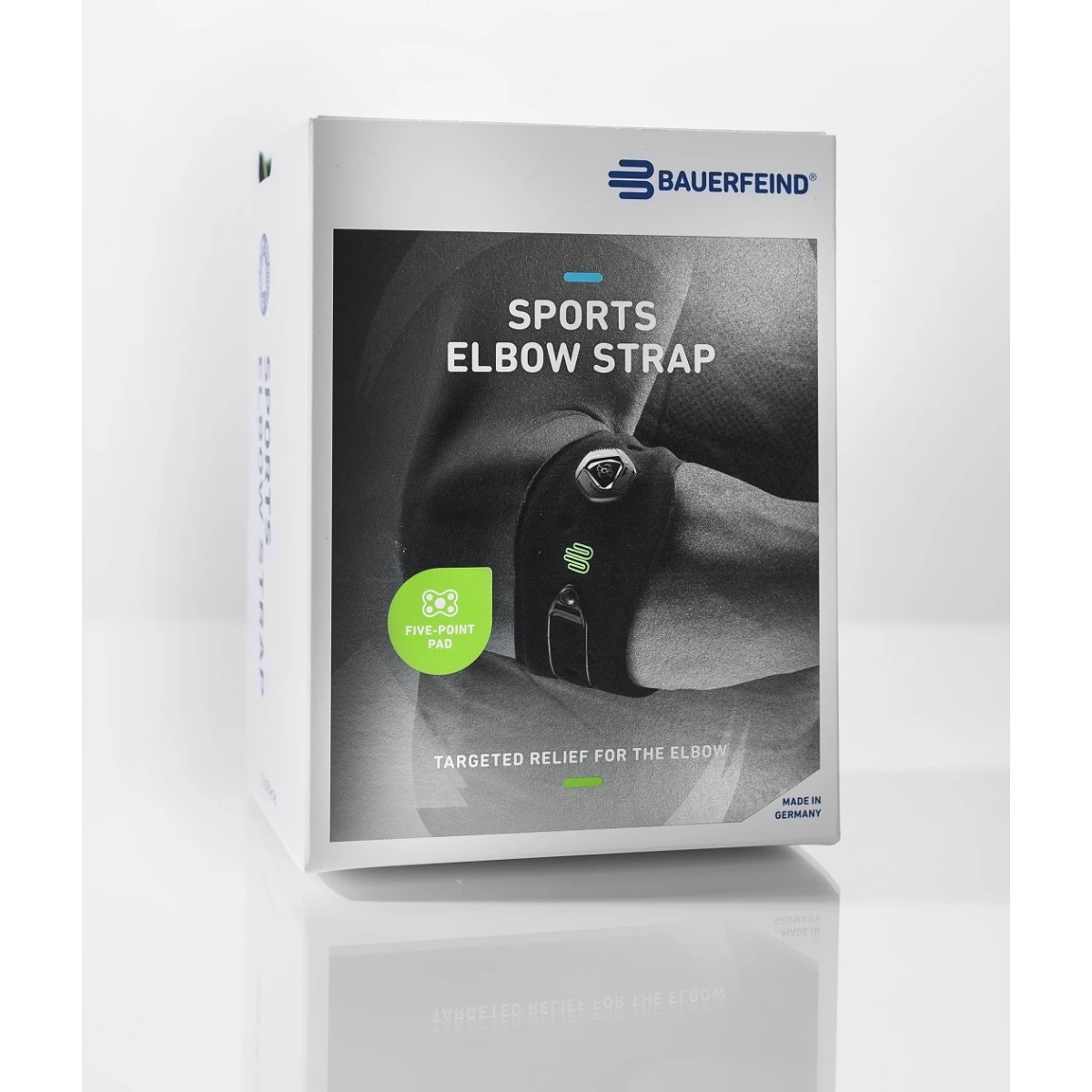 - ihre unterschiedlich einklettbare Fünfpunkt-Pelotte liegt entweder an der Außen- oder Innenseite auf und stimuliert Schmerztriggerpunkte, die typisch für einen Tennis- oder