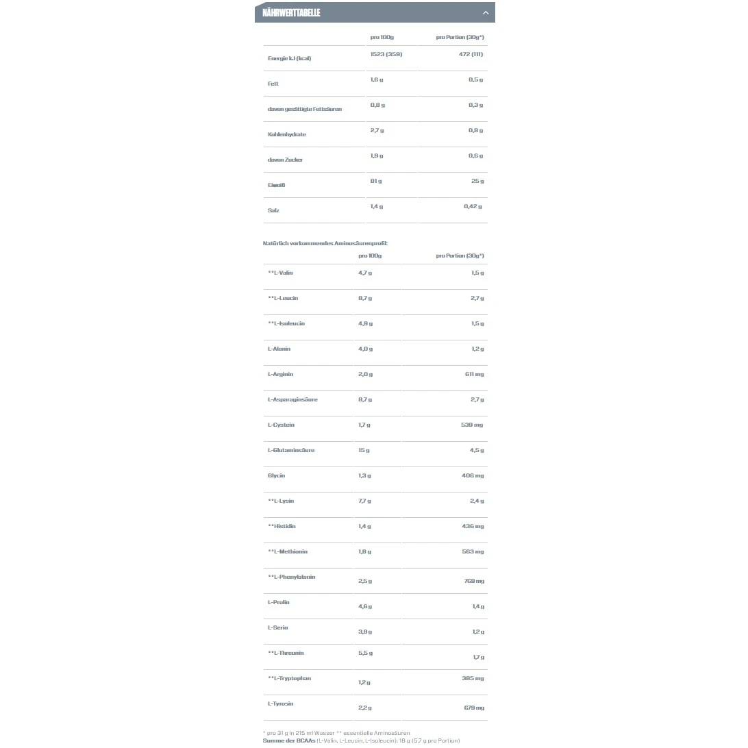 - jede Portion enthält 5,6–5,8 g BCAAs und davon 2,6–2,7 g der wichtigen Aminosäure L-Leucin, abhängig vom Geschmack