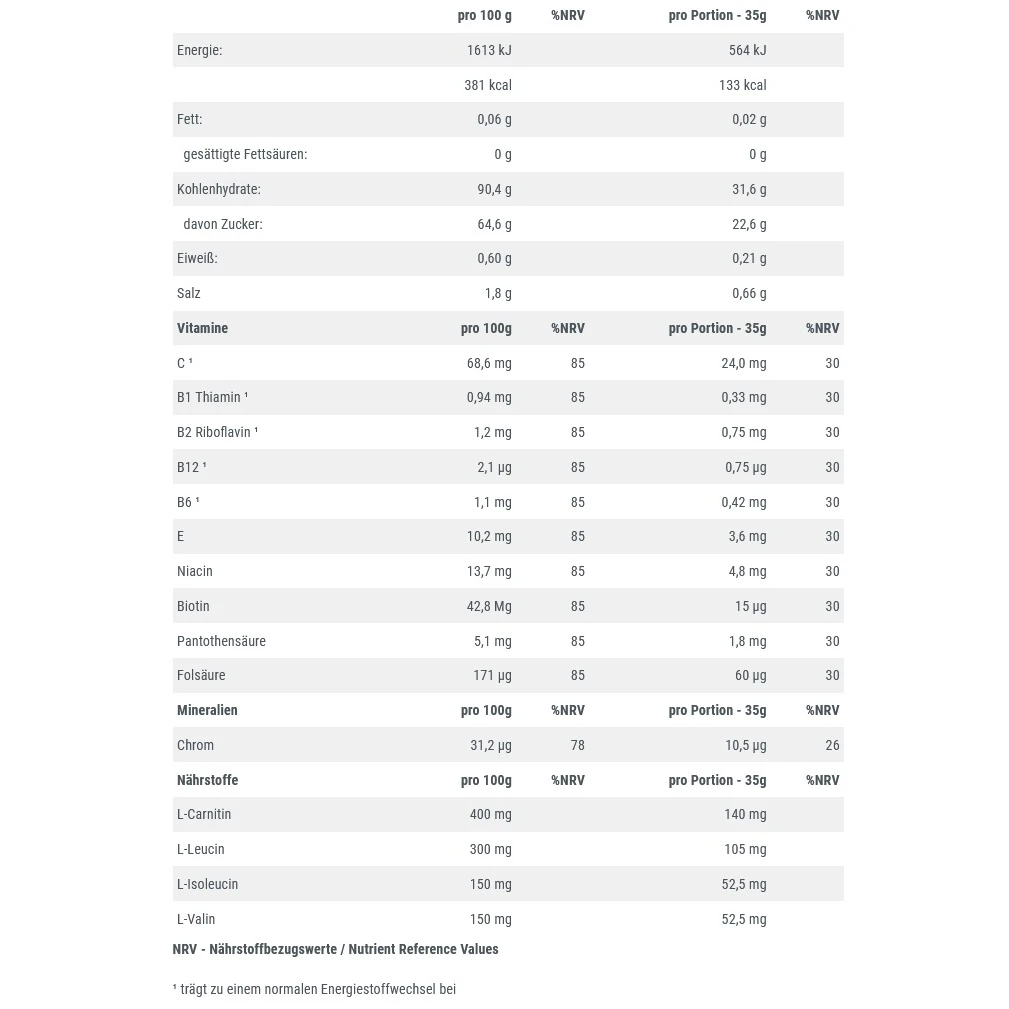 - Zutaten: Maltodextrin, Dextrose, Fruchtzucker, Isomaltulose*, Säuerungsmittel Zitronensäure, Natriumcitrat, Aroma, BCAA Mischung 2:1:1 (Leucin, Isoleucin, Valin), L-Carnitin, Kaliumchlorid, Säuerungsmittel Weinsäure (L+), Magnesiumcarbonat, L-Ascorbinsäure, DL-alpha-Tocopherylacetat, Nicotinamid, Emulgator Sonnenblumenlecithin, Calcium-d-pantothenat, Farbstoff Beta-Carotin, Pyridoxinhydrochlorid, Thiaminhydrochlorid, Riboflavin, Pteroylmonoglutaminsäure, Chrom-III-chlorid hexahydrat, D-Biotin, Cyanocobalamin