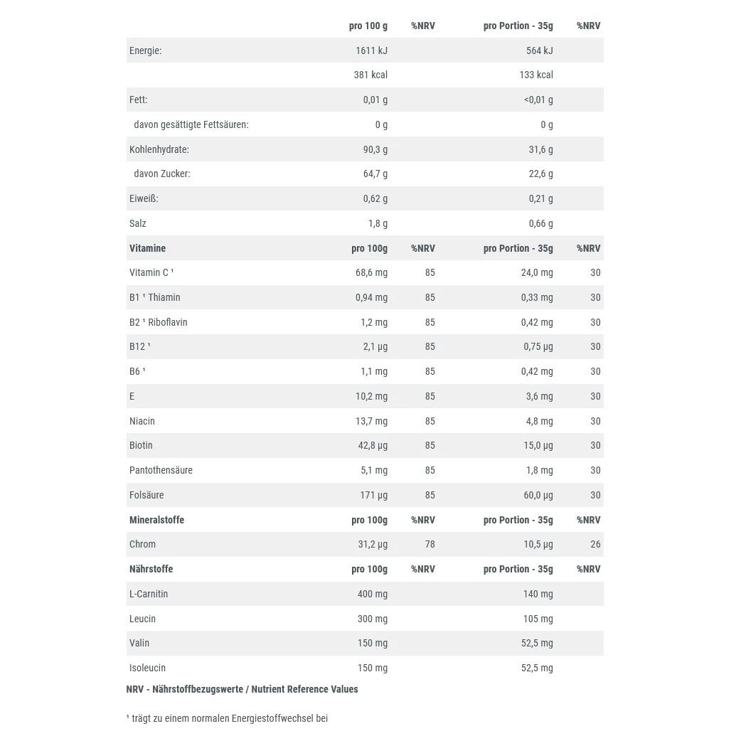 - Zutaten: Maltodextrin, Dextrose, Fruchtzucker, Isomaltulose*, Säuerungsmittel Zitronensäure, Natriumcitrat, Aroma, BCAA Mischung 2:1:1 (Leucin, Isoleucin, Valin), Rote Bete Saftkonzentrat, L-Carnitin, Kaliumchlorid, Säuerungsmittel Weinsäure (L+), Magnesiumcarbonat, L-Ascorbinsäure, DL-alpha-Tocopherylacetat, Nicotinamid, Emulgator Sonnenblumenlecithin, Calcium-D-pantothenat, Pyridoxinhydrochlorid, Thiaminhydrochlorid, Riboflavin, Pteroylmonoglutaminsäure, Chrom-III-chlorid hexahydrat, D-Biotin, Cyanocobalamin