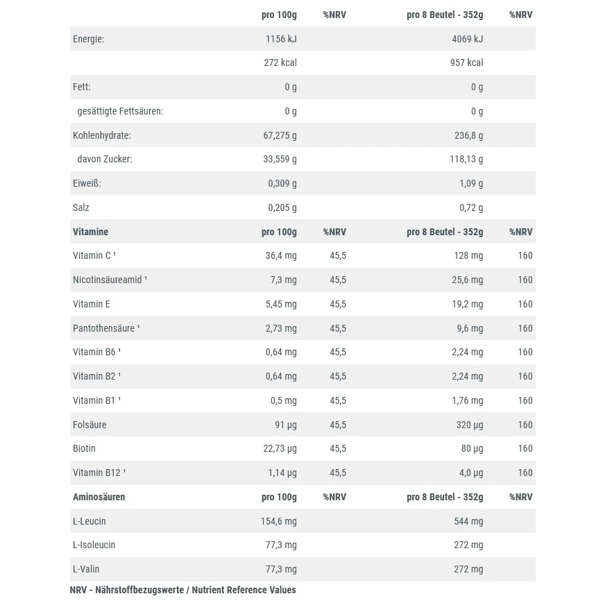 - Zutaten: Maltodextrin (37%), Wasser, Dextrose (21,14%), Isomaltulose* (9,1%), Säuerungsmittel Citronensäure, Natriumchlorid, L-Leucin, Kaliumchlorid, Aroma, Konservierungsmittel Kaliumsorbat, L-Isoleucin, L-Valin, Ascorbinsäure, DL-alpha-Tocopherylacetat, Nicotinsäureamid, Calcium-d-pantothenat, Pyridoxinhydrochlorid, Thiaminhydrochlorid, Riboflavin, Folsäure, Biotin, Cyanocobalamin
