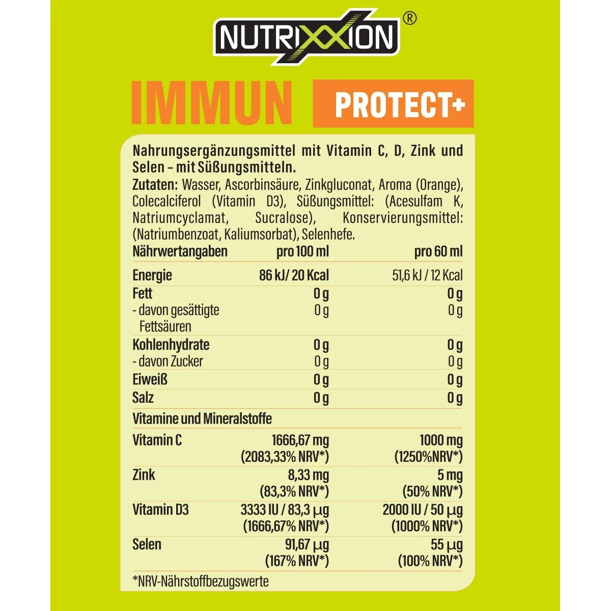 - Zutaten: Wasser, Ascorbinsäure, Zinkgluconat, Aroma (Orange), Colecalciferol (Vitamin D3), Süßungsmittel: (Acesulfam K, Natriumcyclamat, Sucralose), Konservierungsmittel: (Natriumbenzoat, Kaliumsorbat), Selenhefe