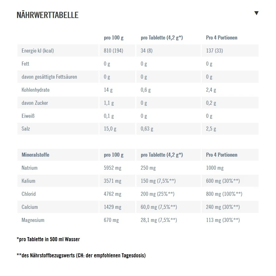 - Verzehrempfehlung: max. 4 Tabletten/Tag