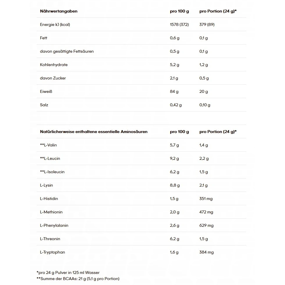 - Premium Molkeneiweißisolat mit 6,1 g BCAAs (L-Leucin, L-Isoleucin, L-Valin) pro Portion
