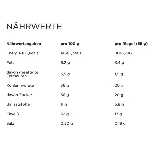 - Verzehrempfehlung: 1 Riegel direkt nach dem Sport