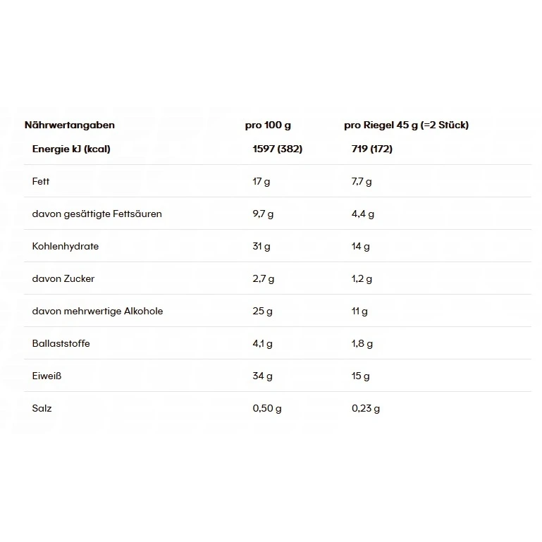 - mit 15 g Protein pro 45 g (= 2 Stück) und mit einer extranussigen Portion Geschmack