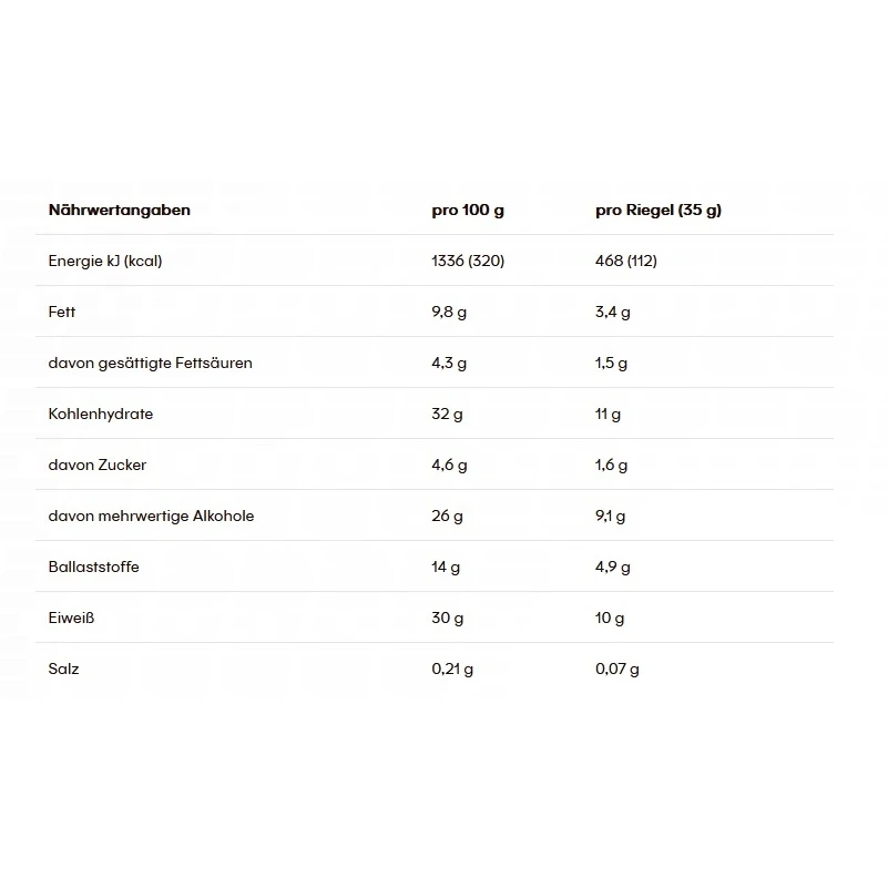 - Zutaten: MILCHeiweiß (CalciumCASEINAT, MOLKEneiweißisolat), Füllstoff (Polydextrose), Feuchthaltemittel (Sorbit, Glycerin), MILCHschokolade mit Süßungsmittel (18%) [Süßungsmittel (Maltit), Kakaobutter, VollMILCHpulver, Kakaomasse, Butterreinfett (MILCH), Emulgator (Lecithine (SOJA)), Aroma], MagerMILCHpulver, Rapsöl, SOJAeiweiß, Aromen, Emulgator [Lecithine (SOJA)]