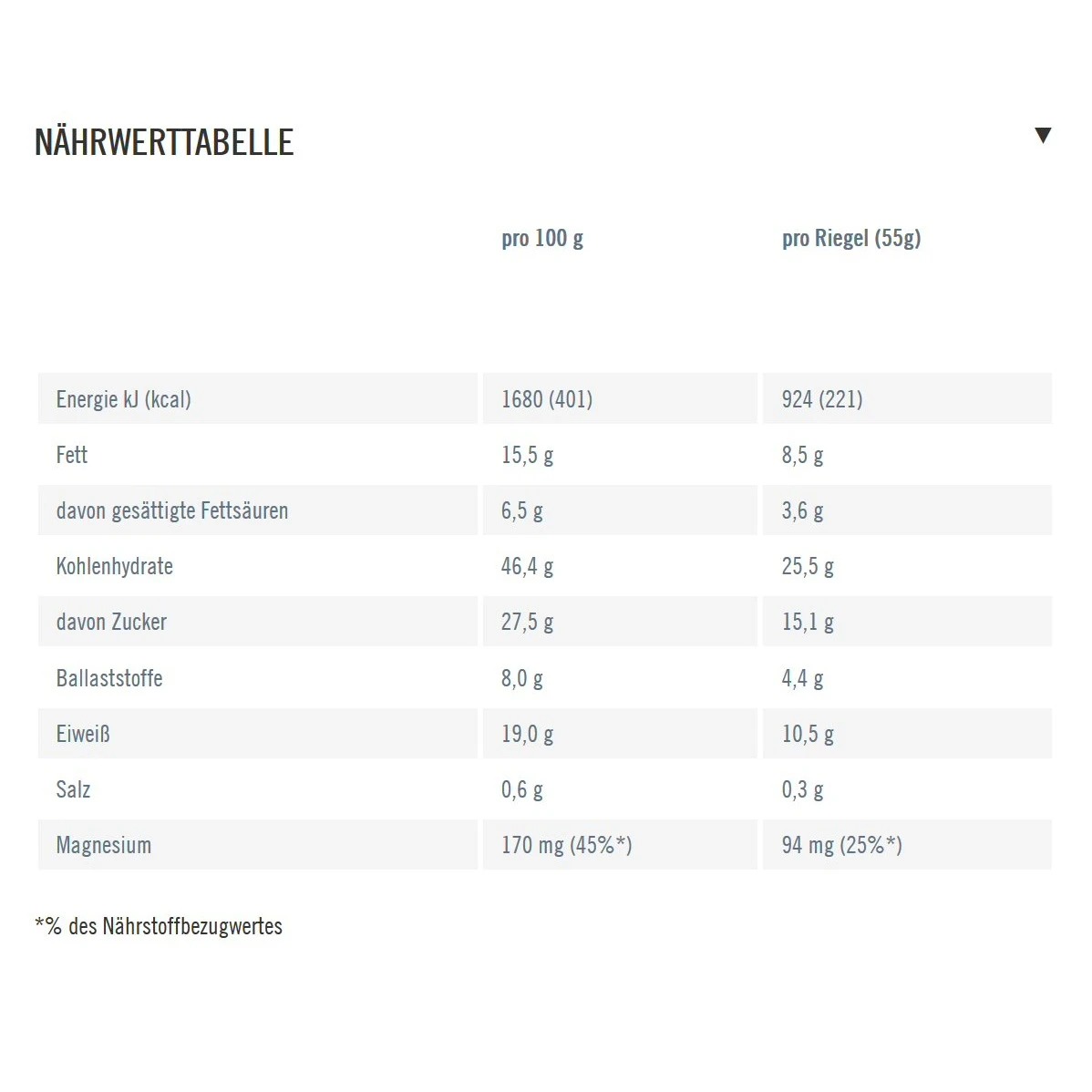 - Verzehrempfehlung: 1 Riegel in der Stunde vor dem Sport