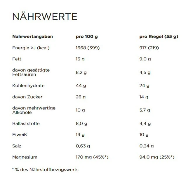 - Verzehrempfehlung: 1 Riegel in der Stunde vor dem Sport