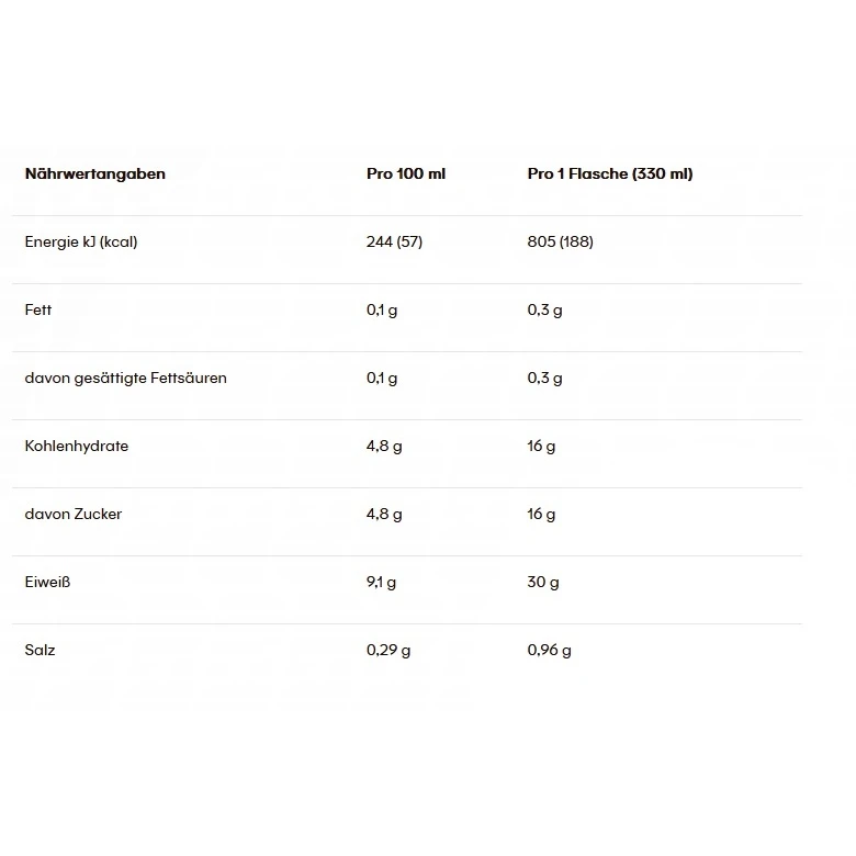 - Proteingetränk aus Magermilch (CH: 0,5% Fett im Milchanteil) mit Milcheiweiß und Süßungsmittel