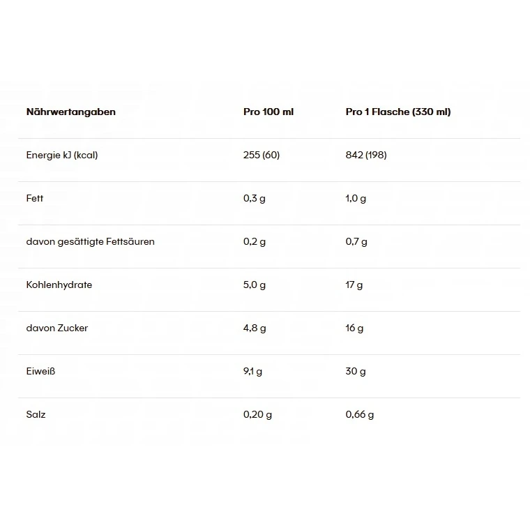 - Proteingetränk aus Magermilch (CH: 0,5% Fett im Milchanteil) mit Milcheiweiß und Süßungsmittel