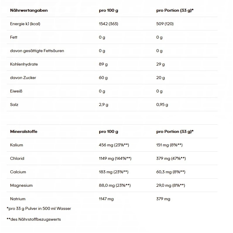 - Zutaten: Dextrose, Maltodextrin, Fruktose, Mineralstoffe (Natriumcitrat, Natriumchlorid, Calciumlactat, Kaliumchlorid, Magnesiumcarbonat), Säureregulator (Citronensäure), natürliche Aromen, Rote-Bete-Saftpulver