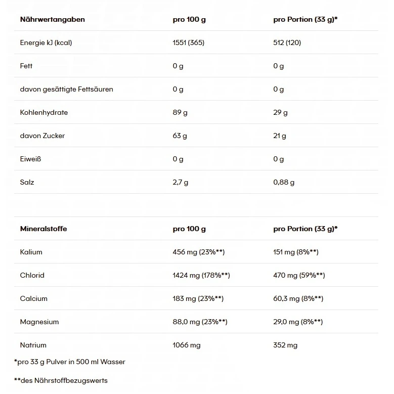 - Zutaten: Dextrose, Maltodextrin, Fruktose, Mineralstoffe (Natriumcitrat, Natriumchlorid, Calciumlactat, Kaliumchlorid, Magnesiumcarbonat), Säureregulator (Citronensäure), natürliches Zitronenaroma, Frucht- und Pflanzenkonzentrate (Färberdistel, Zitrone)