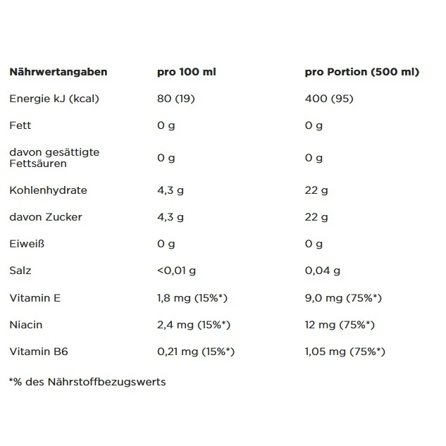 - Zutaten: Natürliches Mineralwasser, Fruktosesirup, Fruchtsäfte aus Fruchtsaftkonzentraten [Grapefruit (3 %), Zitrone (3 %)], Zucker, Säuerungsmittel (Citronensäure), Zitronenextrakt, Konservierungsstoff (Kaliumsorbat), Süßungsmittel (Cyclamat, Saccharin), Antioxidationsmittel (Ascorbinsäure), Stabilisatoren (Pektine, Johannisbrotkernmehl), natürliches Aroma, Nicotinamid (Niacin), DL-α-Tocopherylacetat (Vitamin E), Pyridoxinhydrochlorid (Vitamin B6)