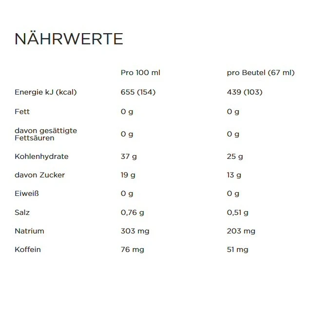 - Geschmacksrichtung Kirsche und Mojito: Erhöhter Koffeingehalt (76 mg/100 ml; 51 mg/Beutel)