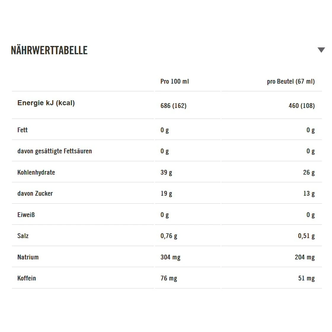 - Geschmacksrichtung Cola: Erhöhter Koffeingehalt (150 mg/100 ml; 100 mg/Beutel)