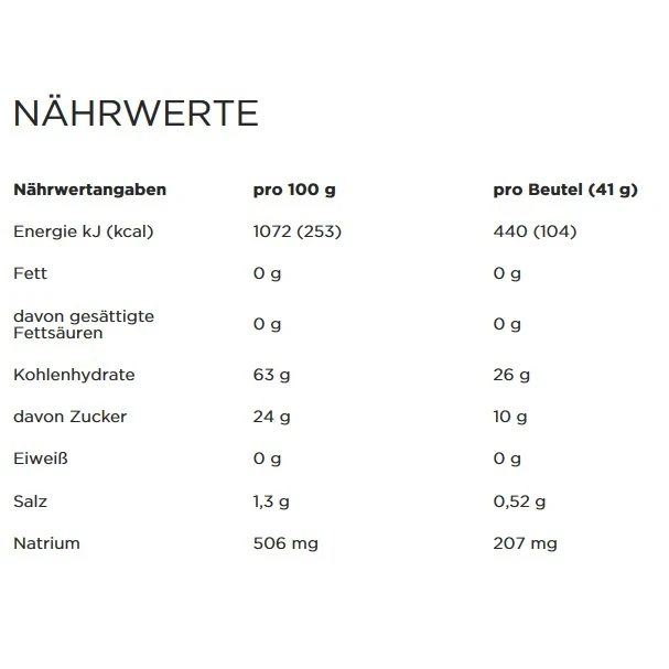 - Zutaten: Maltodextrin, Wasser, Fruktose, Natriumchlorid, Säuerungsmittel (Milchsäure), Natriumcitrate, Konservierungsstoff (Kaliumsorbat), natürliche Aromen