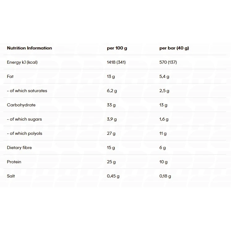 - Zutaten: Füllstoff (Polydextrose), Milchschokolade mit Süßungsmittel (20%) [Süßungsmittel (Maltit), Kakaobutter, Vollmilchpulver, Kakaomasse, Butterreinfett (Milch), Emulgator (Lecithine (Soja)), Aroma], Milcheiweiß (Calciumcaseinat, Molkeneiweißisolat), Feuchthaltemittel (Sorbit, Glycerin), Sojacrispies (5%) (Sojaeiweiß, Stärke, Salz), Süßungsmittel (Maltit), Magermilchpulver, weiße Schokolade mit Süßungsmittel (3%) [Süßungsmittel (Maltit), Kakaobutter, Vollmilchpulver, Emulgator (Lecithine)], Rapsöl, Sojaeiweiß, Sonnenblumenöl, Sheafett, Aromen, Emulgator [Lecithine (Soja)], färbende Pflanzenextrakte (Apfel- und Hibiskuskonzentrate), Salz