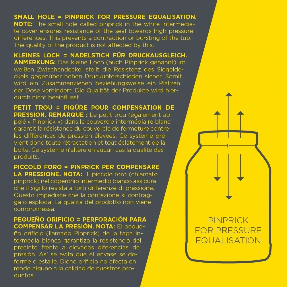 - dieses Loch ist notwendig um durch den Druckausgleich während des Transportes ein Verformen der Dose zu verhindern und schränkt die Qualität unserer Produkte in keiner Weise ein