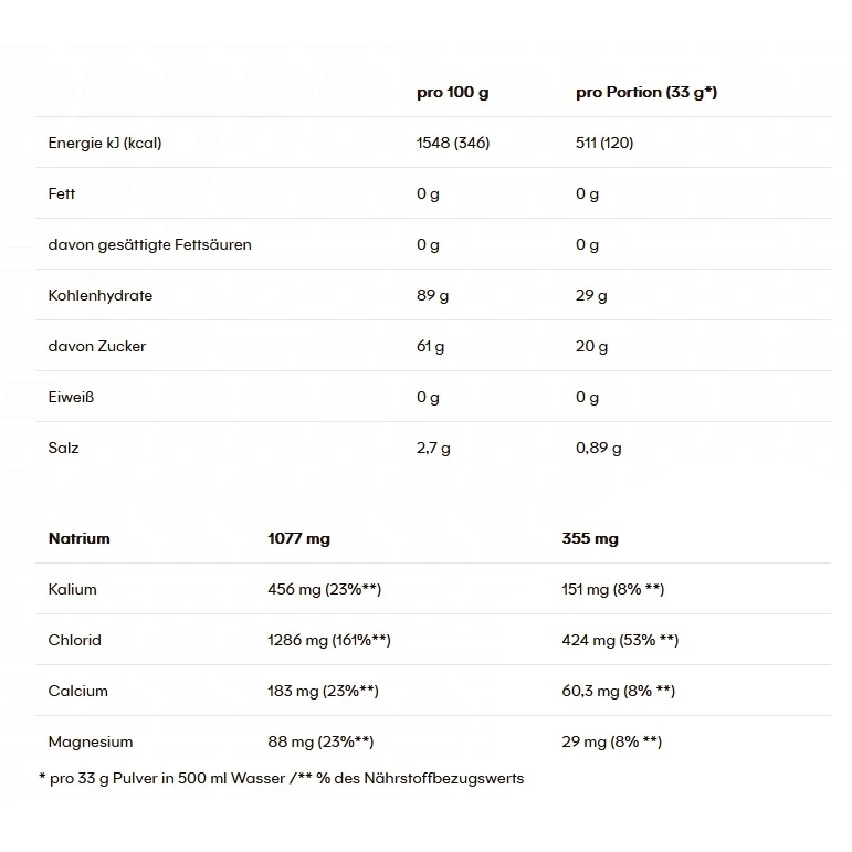 - Zutaten: Dextrose, Maltodextrin, Fruktose, Mineralstoffe (Natriumcitrate, Natriumchlorid, Calciumlactat,Kaliumchlorid, Magnesiumcarbonate), Säureregulator (Citronensäure), natürliches Orangenaroma mit anderen natürlichen Aromen, Frucht- und Pflanzenkonzentrate (Färberdistel, Zitrone), Rote-Bete Saftpulver