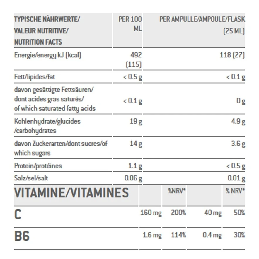 - Zutaten: Wasser, Fructose, Orangensaftkonzentrat, Magnesiumcitrat, Säuerungsmittel (Milchsäure, Ascorbinsäure), Stabilisator Glycerin, Magnesiumbisglycinat, Vitamine (Natriumascorbat, Pyridoxinhydrochlorid), Konservierungsstoff Kaliumsorbat, Süssungsmittel (Steviolglykoside, Sucralose, Natriumsaccharin), Aroma