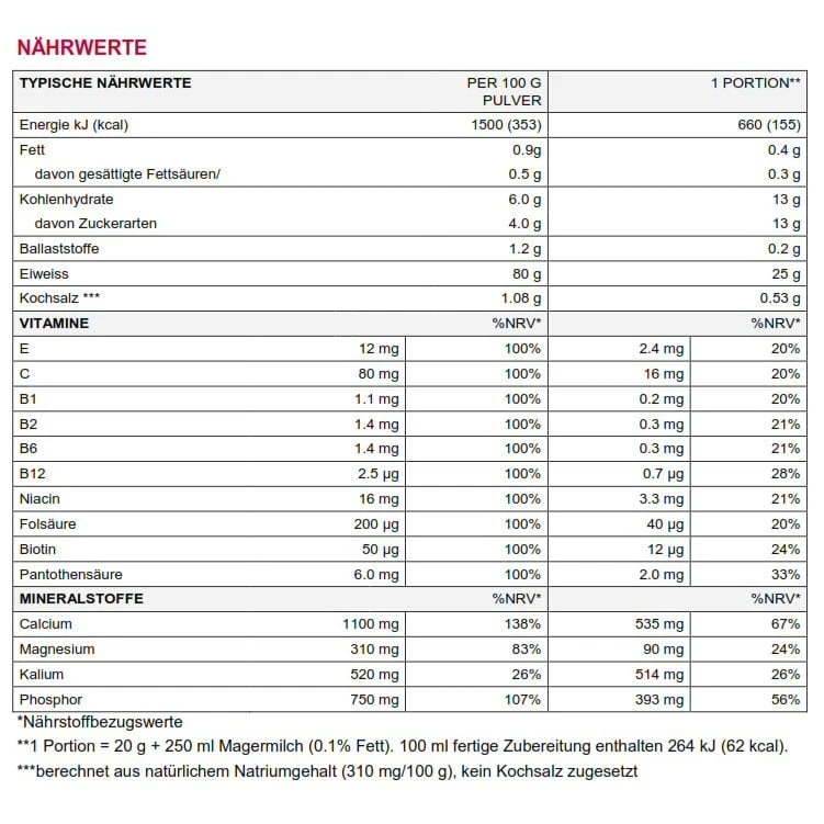 - Zutaten: Proteinpulver 94% (Milchprotein aus Cross-Flow Ultrafiltration, Molkeprotein aus Cross-Flow Mikrofiltration, Eialbumin), Aromen, L-Leucin 1%, Magnesiumcarbonat, Verdickungsmittel (Guarkernmehl, Xanthan), färbender Rote Beete Saft, Säuerungsmittel Apfelsäure, Süssstoffe (Acesulfam K, Neotam), Vitamine (Ascorbinsäure, Nicotinsäureamid, alphaTocopherylacetat, Calciumpantothenat, Pyridoxinhydrochlorid, Riboflavin, Thiaminmononitrat, Folsäure, Biotin, Cyanocobalamin), Antioxidationsmittel Ascorbinsäure. Nur 4.0 g Lactose in 100 g