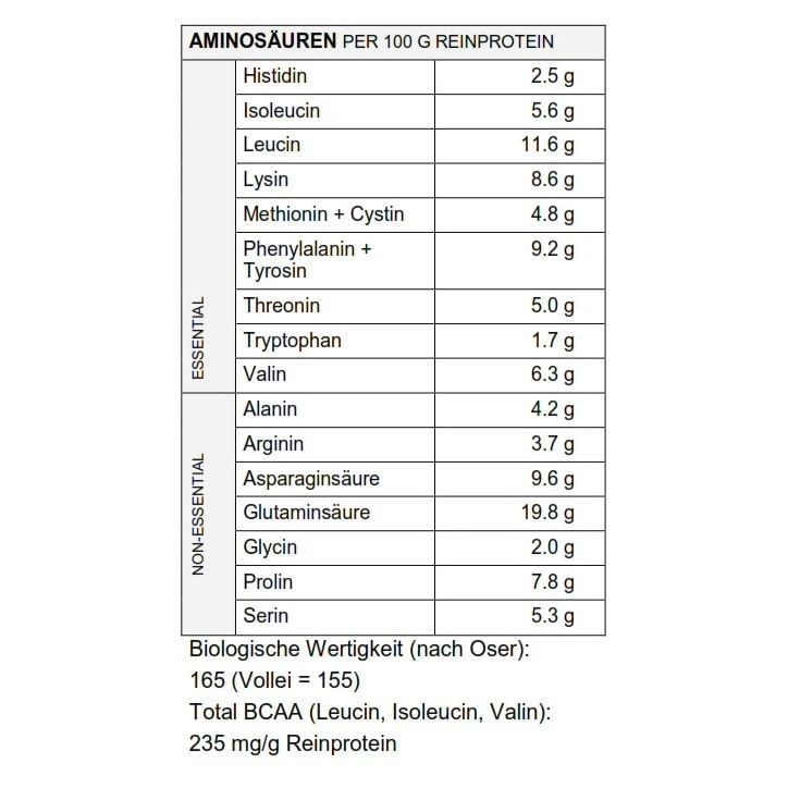 - Aminosäuremuster mit hohem Gehalt an essentiellen Aminosäuren inkl. BCAA