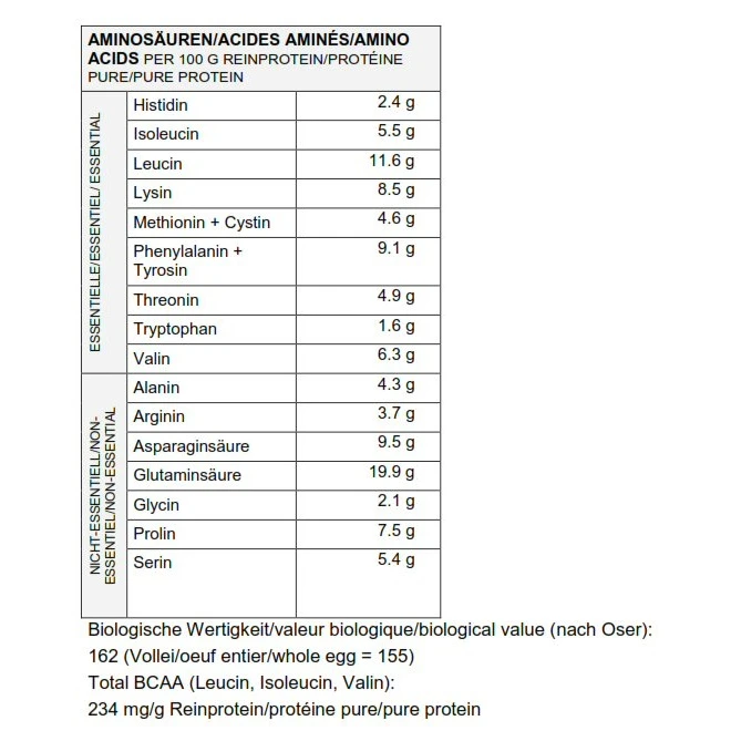 - Aminosäuremuster mit hohem Gehalt an essentiellen Aminosäuren inkl. BCAA