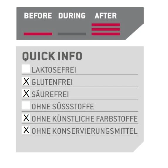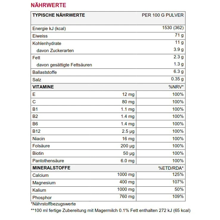 - Zutaten: Proteinpulver 69% (Milchprotein aus Cross-Flow Ultrafiltration, Molkeprotein aus Cross-Flow Mikrofiltration, Eialbumin), Kakao stark entölt 13%, Karamellpulver, Aromen, L-Leucin 1%, Magnesiumcarbonat, Verdickungsmittel (Guarkernmehl, Xanthan), Süssungsmittel (Acesulfam K, Neotam), Vitamine (Ascorbinsäure, Nicotinsäureamid, alphaTocopherylacetat, Calciumpantothenat, Pyridoxinhydrochlorid, Riboflavin, Thiaminmononitrat, Folsäure, Biotin, Cyanocobalamin), Antioxidationsmittel Ascorbinsäure.