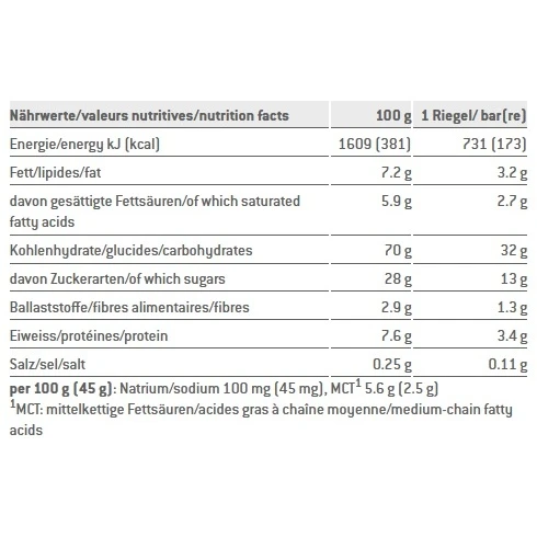 - der Energieriegel ist zusätzlich angereichert mit mittelkettigen Fettsäuren (MCT) aus Kokos- und Rapsöl, welche zusätzliche, leichtverdauliche Energie liefern