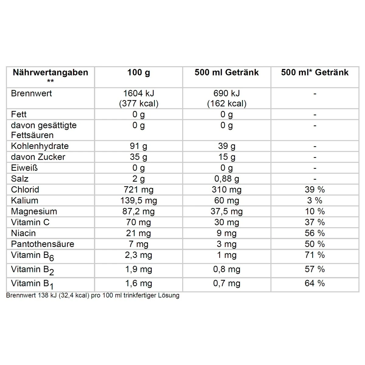 - Zutaten: Maltodextrin (61%), Fructose (20%), Traubenzucker (5,8%), Saccharose (4,3%), Säuerungsmittel Citronensäure, Früchtetee-Extrakt (Hibiskus, Holunderbeeren, Zitronenschalen, Orangenschalen, Hagebutten) (2,3%), Natriumcitrat (1,3%), Natriumchlorid (1,2%), Magnesiumcitrat (0,6%), Säureregulator Kaliumhydrogencarbonat, Aroma (Zitrone, Limette), Vitamine (C, Niacin, Pantothensäure, B6, B2, B1)