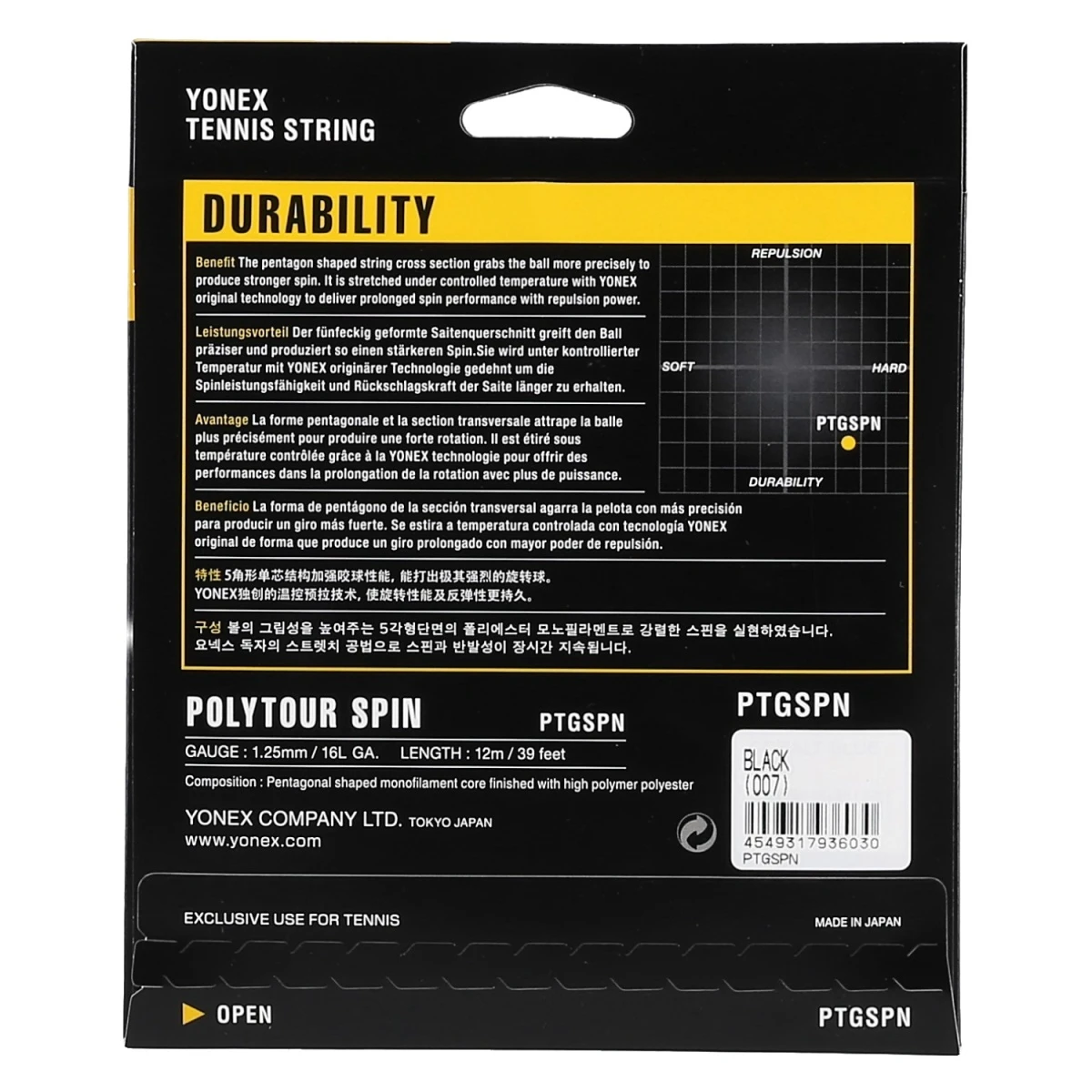 - die Poly Tour Spin wird unter kontrollierter Temepratur mit Yonex originärer Technologie gedehnt um die Spinleistungsfähigkeit und Rückschlagskraft der Saite zu verläängern